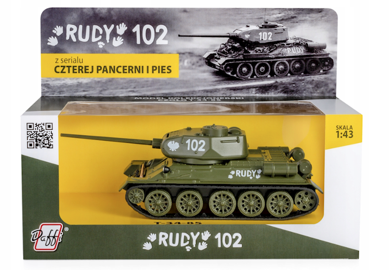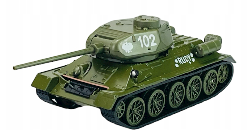 Czołg metalowy z gumowymi gąsienicami w skali 1:43. W czołgu rusza się wieżyczka i lufa. Gąsienice są ruchome. Czołg z kultowego polskiego serialu "Czterej pancerni i pies"
